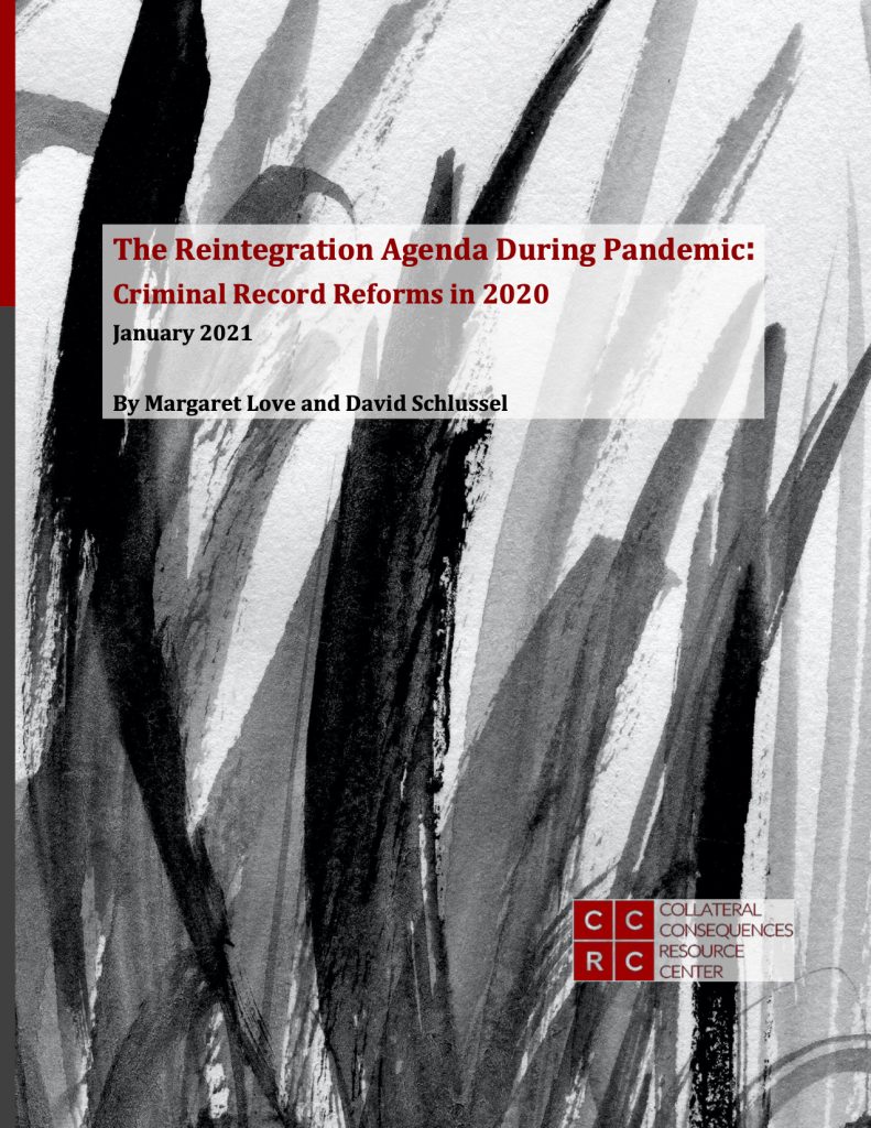 [i] See CCRC annual reports on new legislation describing new restoration and record relief laws from 2013 through 2019, accessible at https://ccresourcecenter.org/resources-2/resources-reports-and-studies/: Pathways to Reintegration: Criminal Record Reforms in 2019 (2020); Reducing Barriers to Reintegration: Fair chance and expungement reforms in 2018 (2019); Second Chance Reforms in 2017: Roundup of new expungement and restoration Laws (2018); Four Years of Second Chance Reforms, 2013 – 2016: Restoration of Rights & Relief from Collateral Consequences (2017).
